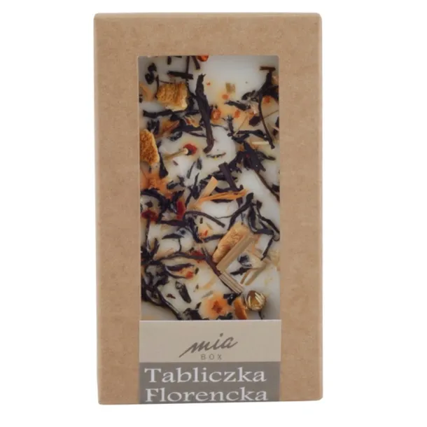 Ręcznie wykonana, niepowtarzalna tabliczka z wosku sojowego z dodatkiem olejków zapachowych, masła shea, suszonych kwiatów, owoców, ziół, ziaren oraz innych ekologicznych zdobień. Powoli uwalniając swój piękny zapach aromatyzuje pomieszczenia i poprawia nastrój. To estetyczny nośnik wspaniałych nut zapachowych, które równocześnie służą jako unikalne elementy dekoracji. Tabliczka florencka jest naturalnym, ekologicznym produktem do szerokiego zastosowania. Umieść ją na komodzie, zawieś w łazience, włóż do szuflady lub szafy, a jej wnętrze wypełni się pięknym, uwodzicielskim zapachem. To wspaniały prezent, oryginalny i niepowtarzalny. Nie ma dwóch takich samych tabliczek. Ich wykonanie to 100% handmade;).