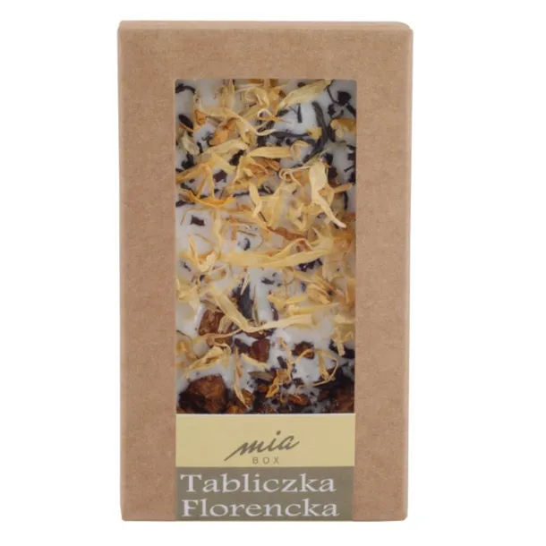 Ręcznie wykonana, niepowtarzalna tabliczka z wosku sojowego z dodatkiem olejków zapachowych, masła shea, suszonych kwiatów, owoców, ziół, ziaren oraz innych ekologicznych zdobień. Powoli uwalniając swój piękny zapach aromatyzuje pomieszczenia i poprawia nastrój. To estetyczny nośnik wspaniałych nut zapachowych, które równocześnie służą jako unikalne elementy dekoracji. Tabliczka florencka jest naturalnym, ekologicznym produktem do szerokiego zastosowania. Umieść ją na komodzie, zawieś w łazience, włóż do szuflady lub szafy, a jej wnętrze wypełni się pięknym, uwodzicielskim zapachem. To wspaniały prezent, oryginalny i niepowtarzalny. Nie ma dwóch takich samych tabliczek. Ich wykonanie to 100% handmade;).