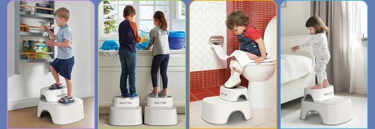 - Wielofunkcyjny podnóżek dla malucha: Ten podnóżek pomaga dziecku samodzielnie korzystać z toalety, dosięgnąć zlewu, aby się umyć, oraz nauczyć je korzystania z toalety. Zachęca również dziecko do towarzyszenia Ci podczas gotowania w kuchni. Podnóżek dla malucha może być również używany w salonie lub sypialni jako siedzisko lub podnóżek pomocniczy.