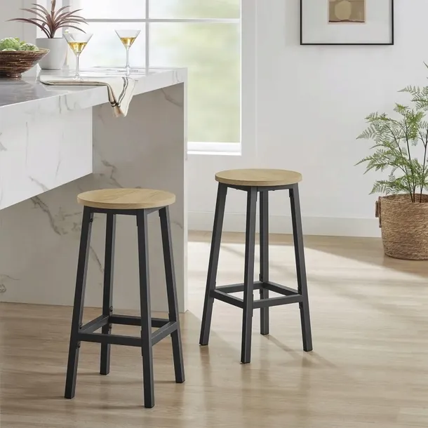Stylowe taborety zostały wykonane w kolorze sonoma, Każdy z taboretów został wyposażony w podnóżek, który zwiększa wygodę użytkowania i stabilność mebla,