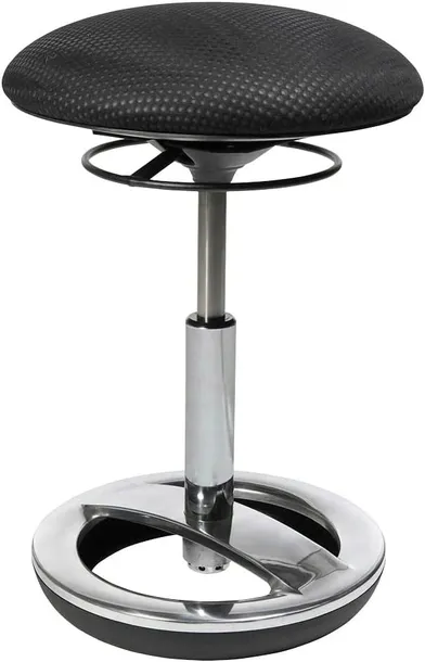 Opatentowany taboret fitness zapewnia ergonomiczne i ruchome siedzenie, trenuje plecy i działa prewencyjnie przeciwko problemom z plecami. Wszechstronne zastosowanie w biurze, pokoju dziecięcym, warsztacie, kuchni i gospodarstwie domowym itp. Bezstopniowa regulacja wysokości siedziska z chromowaną sprężyną gazową za pomocą pierścieniowej dźwigni zwalniającej pod siedzeniem. Efekt poziomego kołysania dzięki ruchomemu elementowi z TPU (termoplastyczny poliuretan). Designerski pierścień podstawy aluminium polerowane Model ten posiada znak GS Intertek i spełnia wszystkie wymagania bezpieczeństwa Powierzchnia siedziska 3D z materiału siateczkowego czarna (100% poliester) Wysokość siedziska: 44 – 57 cm; średnica siedziska: 36,5 cm Obciążenie: do 110 kg. Maksymalny rozmiar użytkownika: ok. 1,92 m. Zalecany czas użytkowania/dzień: maks. 4 godziny dziennie.