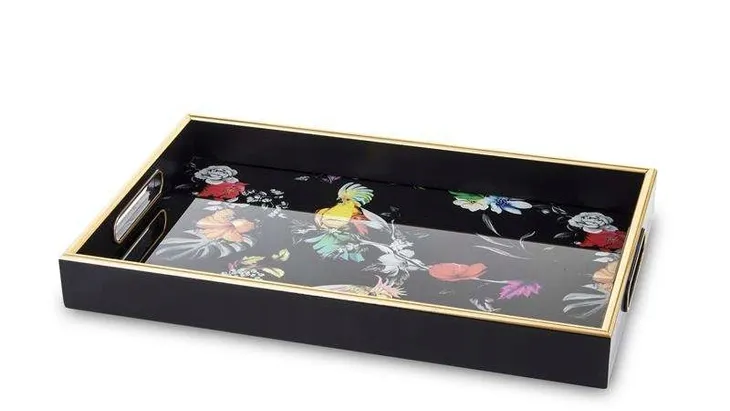 Dekoracyjna taca z papugami i tropikalnym wzorem to dodatek, który ożywi każde wnętrze. Doskonale łączy w sobie barwną radość z elegancką formą – dzięki czemu pasuje zarówno do nowoczesnych, jak i eklektycznych aranżacji.