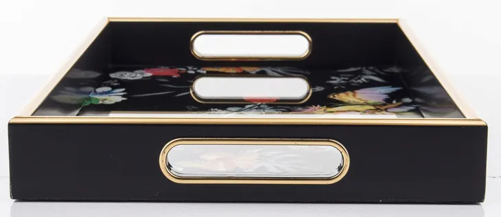 Świetna jako organizer na toaletkę, taca na przyjęcie, podstawka pod flakony czy ekspozytor na dekoracje sezonowe. Złote detale i intensywne kolory tworzą kompozycję, która nie pozostaje niezauważona.