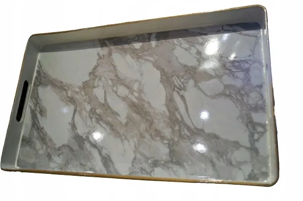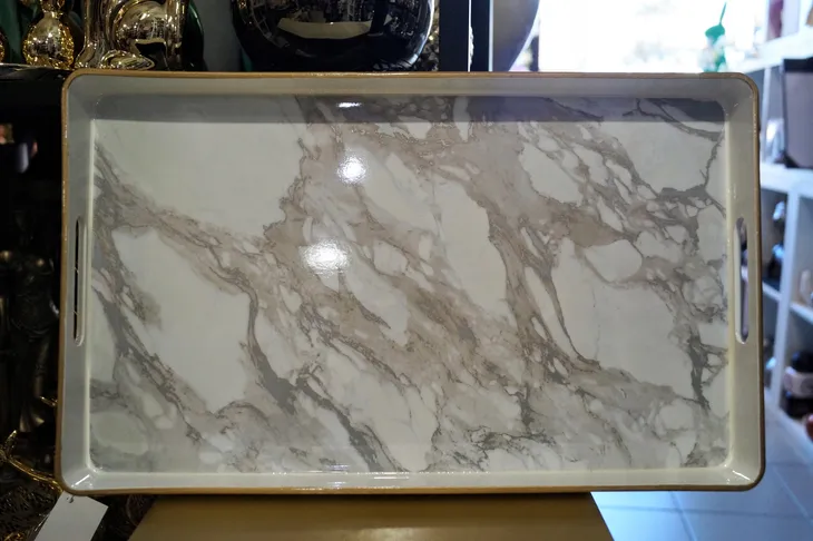 Jest to świetny sposób na serwowanie posiłków oraz jako element dekoracyjny. Marmurowy styl tacy, oraz złote wykończenia nadają elegancji.