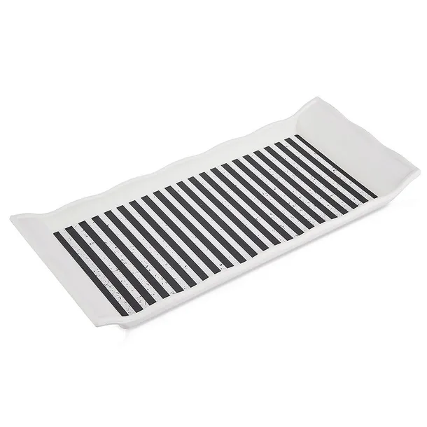 ✅ Solidna i wytrzymała - Wykonana jest z najwyższej jakości tworzywa w białym kolorze. Wewnętrzna część tacy jest w biało - czarne pasy.