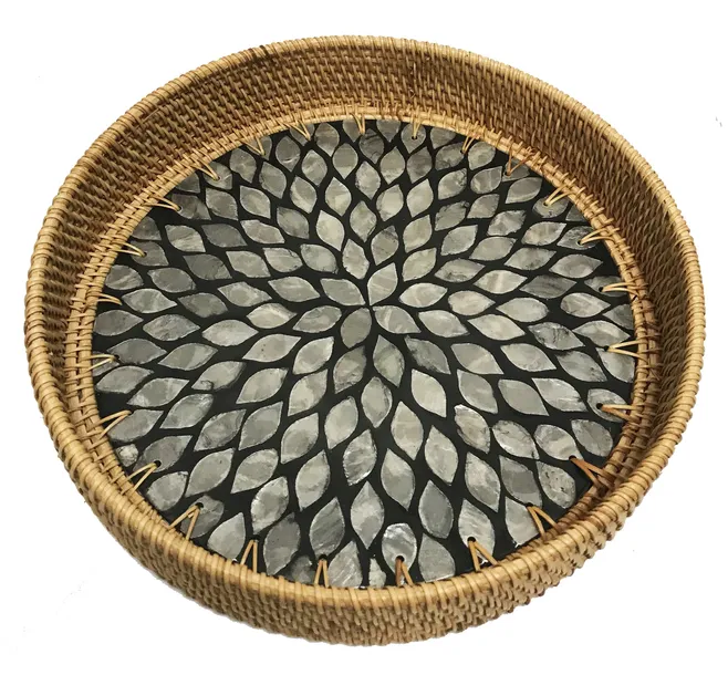 Duża rattanowa, ręcznie tkana taca dekoracyjna o średnicy 30cm. zdobiona