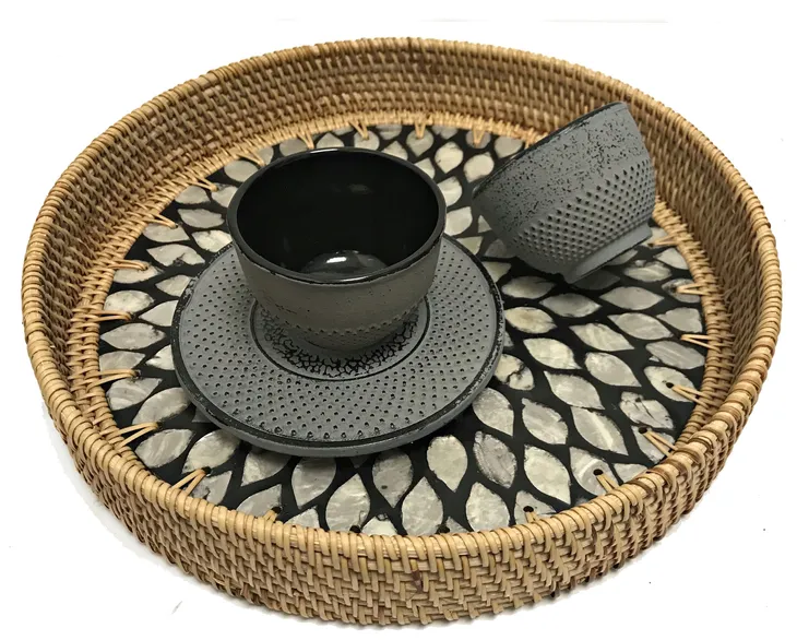 Okrągła taca jest wykonana w naturalnych rustykalnych kolorach, prosta, ale elegancka do dekoracji i pasuje do większości mieszkań, kuchni, domów wiejskich, domów herbacianych lub kawiarni.