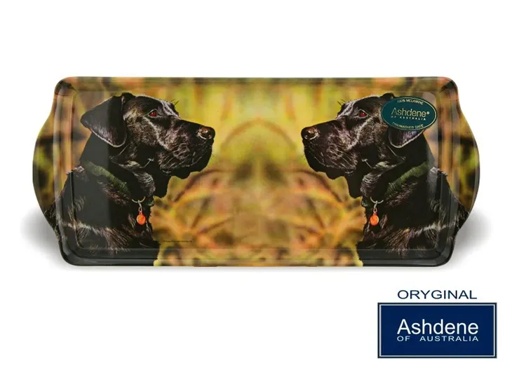 Taca przekąskowa ozdobiona zdjęciem dwóch czarnych labradorów z pewnością zajmie honorowe miejsce w domu miłośnika tych wiernych psów. -
