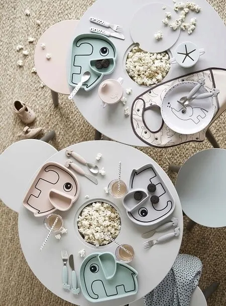 Talerzyk z Przyssawką Blue Done by Deer. Elphee jest gotowy do posiłku! Talerzyk silikonowy „Stick & Stay” z dwoma praktycznymi komorami pozostanie na miejscu i pomoże Maluchom opanować umiejętność samodzielnego jedzenia. Talerzyk posiada bezpieczną podstawę z dużą przyssawką, uniemożliwi przesuwanie się talerzyka po stole. Talerzyk jest łatwy do usunięcia przez rodziców, ale trudny dla dzieci. Wystarczy podnieść do góry silikonowy uchwyt ukryty za uchem Elphee, aby podnieść talerzyk, niewidoczny dla dziecka. Przyssawka zapobiega poślizgom, przewróceniu, pchaniu lub podrzucaniu, dzięki czemu rodzic będzie miał pewność, że jedzenie nie wyląduje na stole. Zaokrąglone wewnętrzne krawędzie zostały tak zaprojektowane, aby ułatwić dziecku samodzielne nabieranie jedzenia. Talerzyk w kształcie słonika Elphee przykuje uwagę dziecka, a jedzenie nie będzie już obowiązkiem, a sprawi dziecku wiele radości.