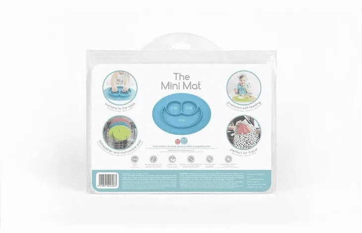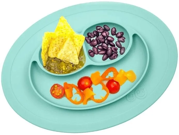 EZPZ Silikonowy talerzyk miętowy z podkładką mały 2w1 Mini Mat to poręczna podkładka oraz talerzyk w jednym. Wykonany został z bezpiecznego silikonu. Posiada zamykane opakowanie, co pozwala zabrać go ze sobą w podróż. Ta nowoczesna silikonowa podkładka idealnie przywiera do stołu lub innej gładkiej powierzchni. Dzięki temu zapobiega przed zsunięciem jej przez dziecko ze stołu. Posiada owalny kształt i estetyczny wygląd. Talerzyk podzielony jest na 3 przegródki, co pozwala na podzielenie posiłku na porcje.
