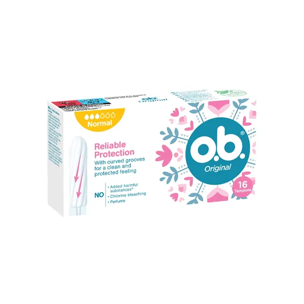 O.b.® Original Normal Niezawodna ochrona dzięki skręconym rowkom. Skręcone rowki efektywnie kierują płyn do wnętrza tamponu Technologia StayDry utrzymuje suchy sznureczek i pomaga Ci czuć się czysto. Odpowiednie na dni o umiarkowanie intensywnym lub obfitym krwawieniu.