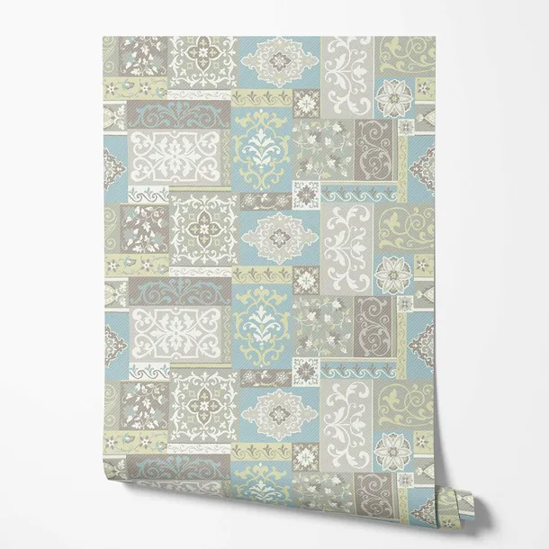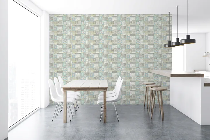 TAPETA NA ŚCIANĘ KAFELKI WZORY NIEBIESKI ZIELONY DO JADALNI SALONY SYPIALNI