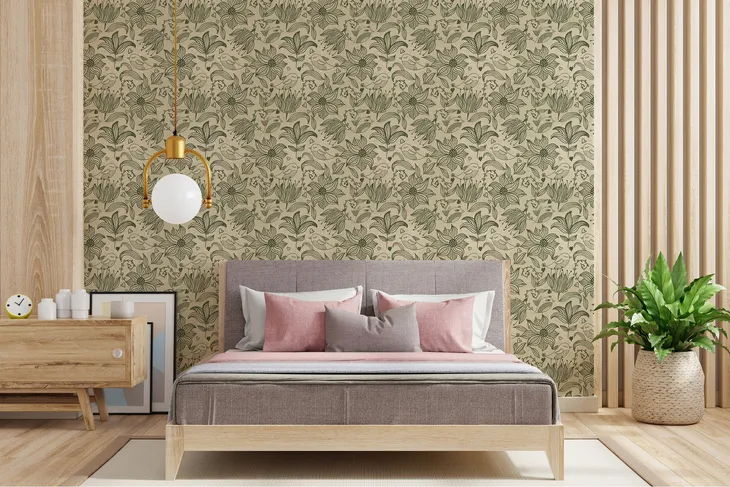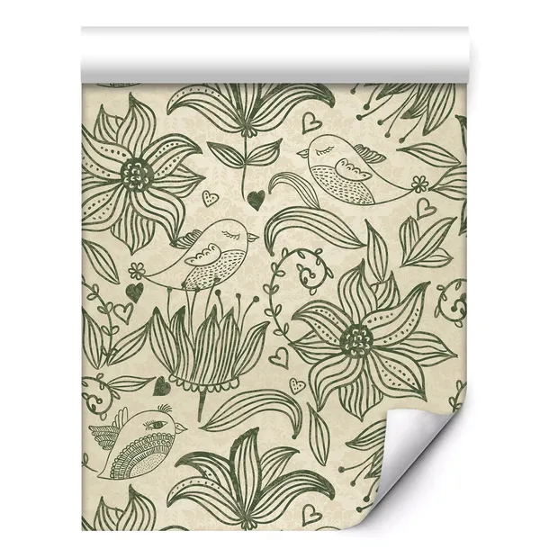 TAPETA NA ŚCIANĘ OLIWKOWE KONTURY KWIATÓW BEŻOWE TŁO DO SYPIALNI SALONU