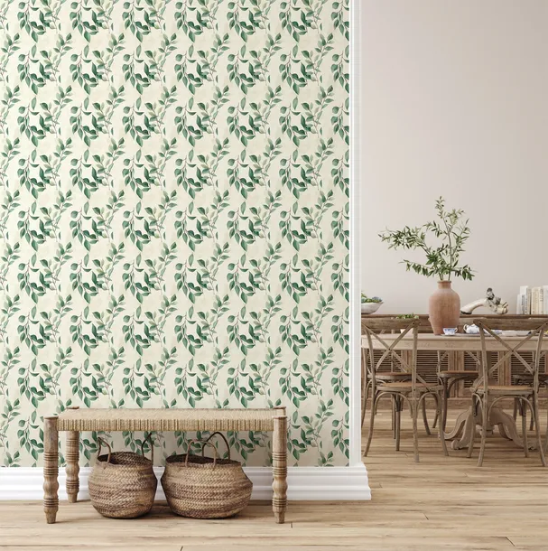 <h2>TAPETA NA ŚCIANĘ ZIELONE LIŚCIE ESTETYCZNE ECRU TŁO DO KUCHNI JADALNI BIURA</h2>
