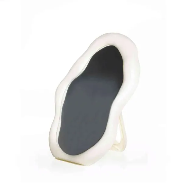 Lusterko kosmetyczne z podpórką o unikalnym kształcie, idealne na toaletkę lub jako ozdoba w sypialni.