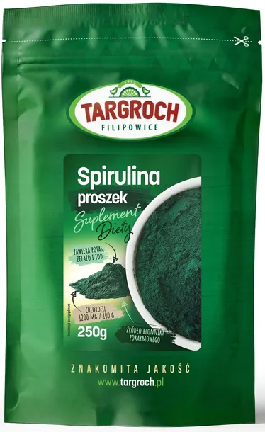 Targroch Spirulina proszek 250 g to suplement diety w formie proszku dedykowany wszystkim osobom pragnącym wzbogacić swoją suplementację o dobrej jakości źródło spiruliny – mikroalgi znanej z bogactwa substancji odżywczych i wielu cennych właściwości.