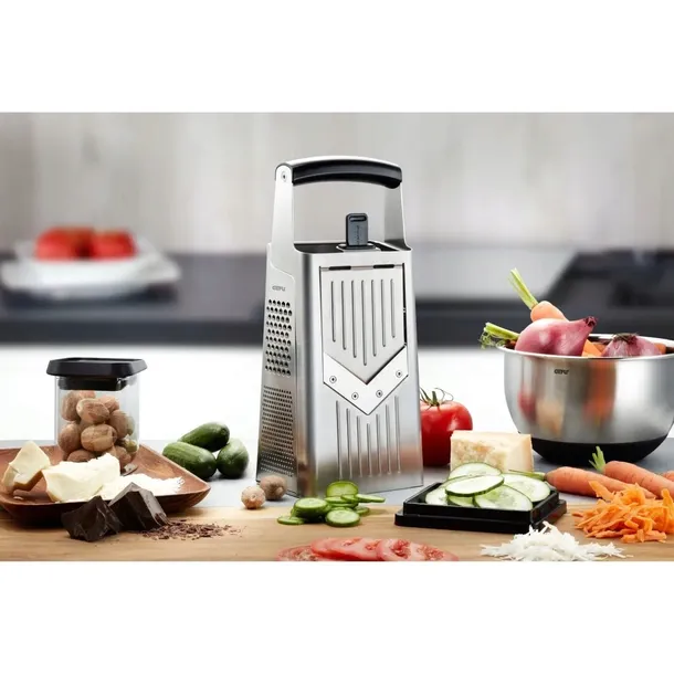To jednak nie wszystko, co oferuje ta tarka 7 w 1! Posiada ona szorstką powierzchnię do surowych składników, 2-stronną powierzchnię do twardego sera, warzyw i czekolady, podwójną powierzchnię tarki (drobną do parmezanu i czekolady oraz bardzo drobną do skórki z cytryny lub gałki muszkatołowej) oraz niezwykle ostrą krajalnicę w kształcie litery V, z 3 regulowanymi grubościami plastrów: 1.5 mm, 2.5 mm i 3.5 mm.