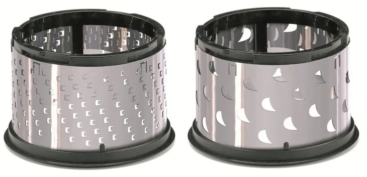 Młynek z dwoma wymiennymi bębnami idealnie sprawdzi się przy rozdrabnianiu parmezanu, orzechów, czekolady i małych warzyw. Dokręcany pojemnik pozwala nam decydować, czy chcemy zetrzeć produkt do pojemnika czy bezpośrednio na przygotowaną potrawę. Ostrość bębnów zapewnia laserowe cięcie.