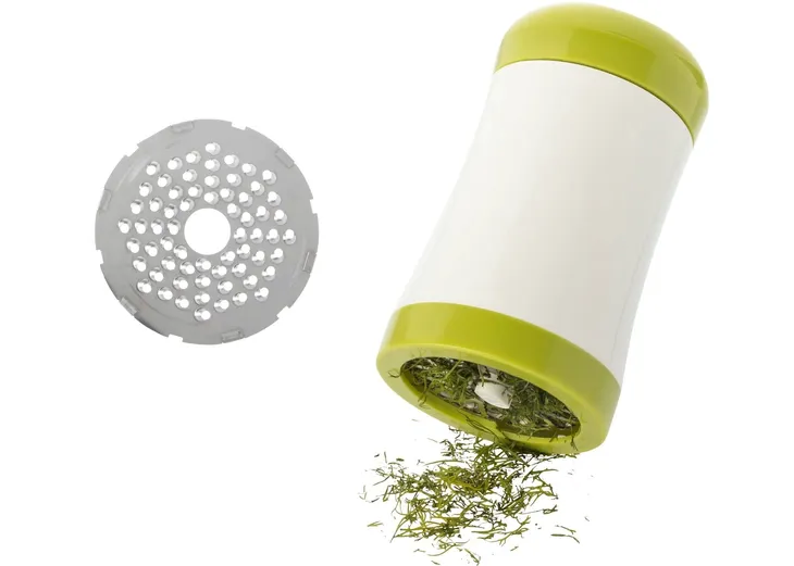 - Zioła: 2 tarcze tnące –łatwe napełnianie, bezproblemowe cięcie poprzez obracanie czerwonej głowicy w obu kierunkach, dzięki czemu 2 ostre tarcze do cięcia ziół są optymalnie przesuwane, bez rozgniatania ziół