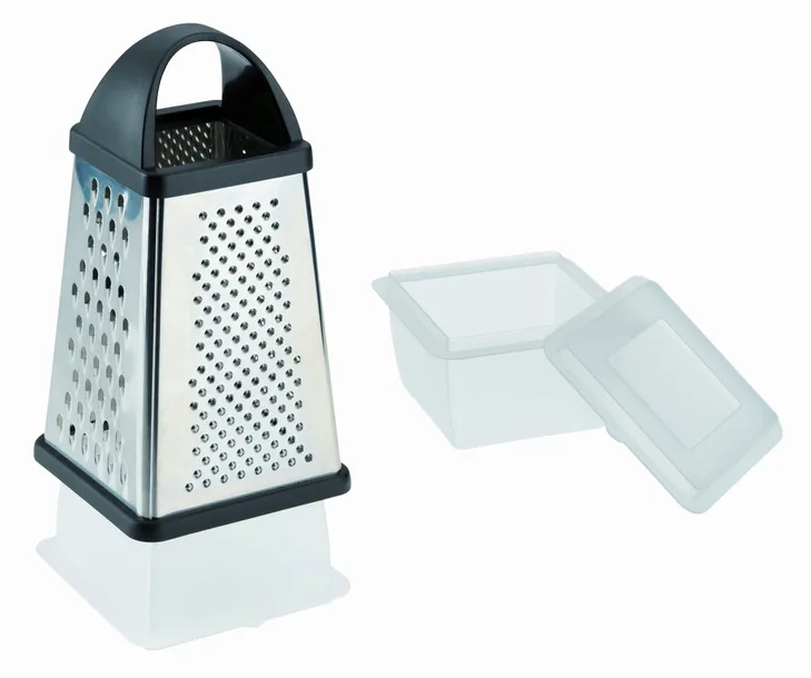 Tarka WestmarkDuża czterostronna tarka z tacą zbierającą i 4 powierzchniami do cięcia/tarcia, do grubego/drobnego/bardzo drobnego tarcia/krojenia owoców, warzyw, orzechów, twardego sera lub czekolady; do zastosowania w branży gastronomicznej lub w domu. Łatwe, grube i drobne tarcie lub krojenie potraw w celu szybkiego przygotowania dań, takich jak placki ziemniaczane, sałatki z surowych warzyw i potrawy dla dzieci, dzięki ostrym ostrzom ze stali nierdzewnej. Dzięki zaokrąglonemu plastikowemu uchwytowi tarka dobrze leży w dłoni podczas przygotowywania; zintegrowany pojemnik z pokrywką do przechowywania startej żywności; przechowywanie pojemnika do góry nogami na tarce Materiał: stal nierdzewna/czarny Wymiary: 13 x 13,6 x 25 cm
