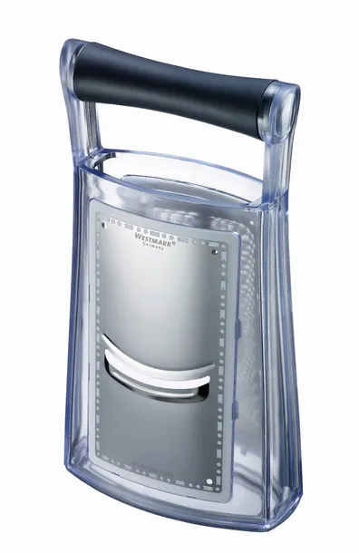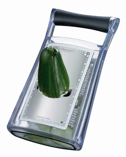 Tarka. Posiada szatkownicę i duże oczka. Posiada rączkę ułatwiającą trzymanie i pojemnik. Antypoślizgowy spód.