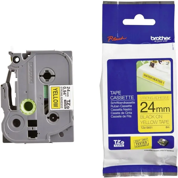 Taśma z MOCNYM KLEJEM do oznaczania powierzchni gładkich, szorstkich, fakturowanych i malowanych proszkowo. Taśma laminowana jak Brother TZe-S651 do drukarek typu PT (P-touch) czarny nadruk na żółtym tle, szerokość 24mm