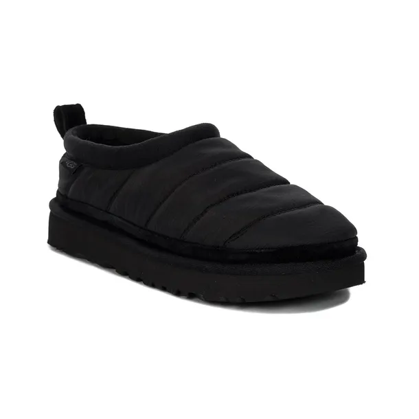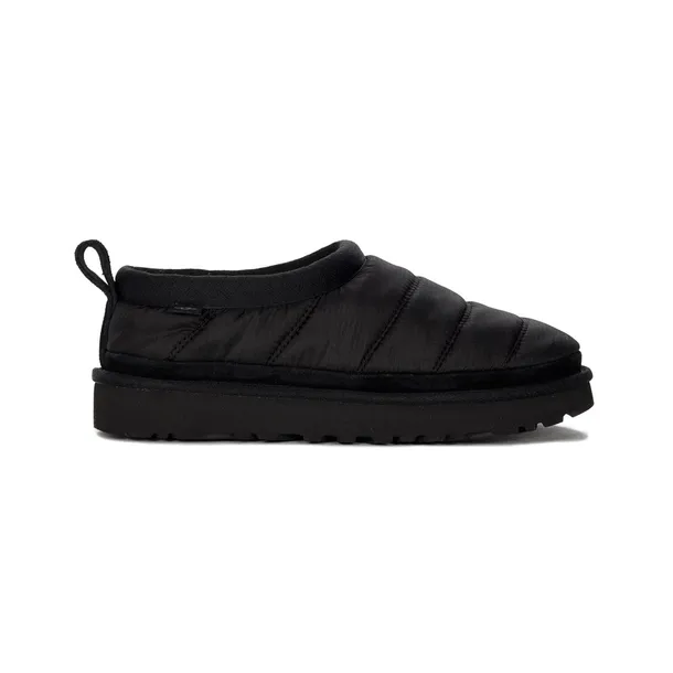 Kapcie damskie znanej z wygody, renomowanej australijskiej marki UGG to absolutny niezbędnik w garderobie każdej kobiety. Wierzch wykonano z tkaniny nylonowej z odrobiną naturalnej zamszowej owczej skóry w kolorze czarnym Black.Całe wnętrze wyściełane miękką, miłą w dotyku i dającą dużo ciepła, owczą wełną. Płaska podeszwa typu platforma wykonana została z wysokogatunkowego tworzywa ma wysokość 3 cm w miejscu obcasa. Model wsuwany z zamkniętym okrągłym noskiem oraz zakrytą piętą. Idealne model na zimowe, chłodne dni. To fason wprost dla Pań ceniących wygodę i oryginalny design.