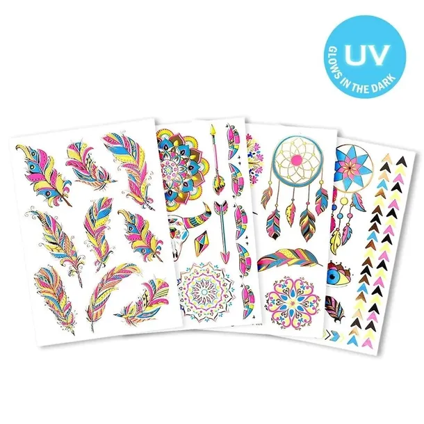 Tatuaże zmywalne na arkuszu o wymiarach 15 x 26 cm. Zestaw tatuaży świecących w świetle UV. Ozdoba ciała na zabawy karnawałowe, festiwale, dyskoteki. Bardzo łatwe w aplikacji za pomocą wilgotnej gąbki. Mix wzorów na blistrze. Towar wysyłany losowo.