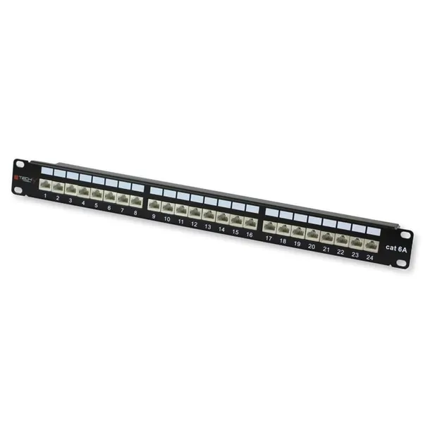 Techly 24 x RJ45 Cat.6A. Standardy komunikacyjne: IEEE 802.3, IEEE 802.3ab, IEEE 802.3an, IEEE 802.3u, Technologia okablowania: 10/100/1000Base-T(X), Rodzaj interfejsu sieci Ethernet: 10 Gigabit Ethernet, Fast Ethernet, Gigabit Ethernet. Kolor produktu: Czarny. Certyfikaty zgodności: RoHS, Certyfikaty: WEEE. Szerokość produktu: 482 mm, Wysokość produktu: 44 mm, Głębokość produktu: 109 mm. Rodzaj opakowania: Pudełko