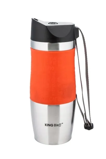 Kubek - termos o pojemności 380 ml wykonany ze stali nierdzewnej z izolacją próżniową THERMO POWER firmy KINGHOFF. Kubek posiada odkręcana pokrywkę z wylewką Quick Stop. Przycisk w pozycji OFF zamyka szczelnie kubek i działa on jak termos. Gdy przycisk jest w pozycji ON można z niego korzystać jak ze zwykłego kubka. Specjalnie ukształtowany ustnik ułatwia picie minimalizując ryzyko rozlania napoju. Izolacja próżniowa sprawia że kubek długo utrzymuje temperaturę wewnątrz, podobnie jak termos. Silikonowy uchwyt i specjalnie skonstruowana przykrywka pozwalają korzystać z kubka podczas podróży. Silikonowa opaska zapewnia pewny chwyt i uniemożliwia wyślizgnięcie się nawet z mokrej dłoni. Dodatkowo przy pokrywie pasek z regulowaną długością. Można za pomocą niego przymocować kubek do plecaka, paska lub po prostu przenosić kubek.