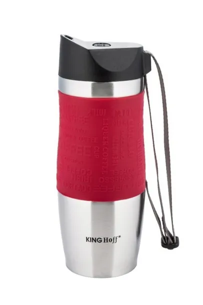 Kubek - termos o pojemności 380 ml wykonany ze stali nierdzewnej z izolacją próżniową THERMO POWER firmy KINGHOFF. Kubek posiada odkręcana pokrywkę z wylewką Quick Stop. Przycisk w pozycji OFF zamyka szczelnie kubek i działa on jak termos. Gdy przycisk jest w pozycji ON można z niego korzystać jak ze zwykłego kubka. Specjalnie ukształtowany ustnik ułatwia picie minimalizując ryzyko rozlania napoju. Izolacja próżniowa sprawia że kubek długo utrzymuje temperaturę wewnątrz, podobnie jak termos. Silikonowy uchwyt i specjalnie skonstruowana przykrywka pozwalają korzystać z kubka podczas podróży. Silikonowa opaska zapewnia pewny chwyt i uniemożliwia wyślizgnięcie się nawet z mokrej dłoni. Dodatkowo przy pokrywie pasek z regulowaną długością. Można za pomocą niego przymocować kubek do plecaka, paska lub po prostu przenosić kubek.