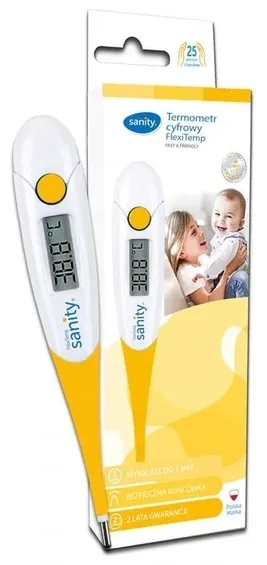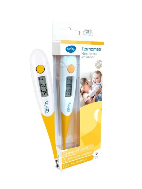 Termometr cyfrowy FlexiTemp gwarantuje szybki i bardzo dokładny pomiar temperatury. Pomiar może być dokonany ustnie, rektalnie i pod pachą. Wynik pojawia się już w ciągu 1 minuty od początku pomiaru. Termometr posiada elastyczną, bezpieczną końcówkę, automatyczny wyłącznik zwiększający żywotność baterii, wskaźnik wymiany baterii na wyświetlaczu. Posiada 2 lata gwarancji.