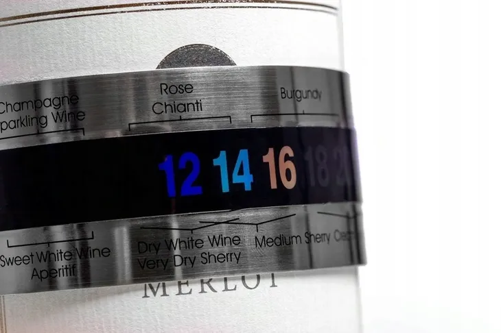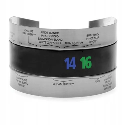 Na opasce zaznaczone są najlepsze i optymalne zakresy temperatury dla popularnych trunków, nie musisz więc o nich pamiętać czy uczyć się ich na pamięć. Po 30-45 s. od założenia na butelkę termometr wskaże przez podświetlenie na zielono właściwą temperaturę (od 4 do 24 stopni) w stopniach Celsjusza.