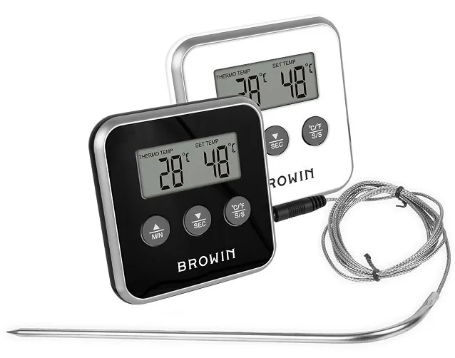Przygotowywanie ulubionych potraw i kontrola ich temperatury jeszcze nigdy nie były takie proste! Termometr z sondą wykonaną ze stali nierdzewnej pozwoli Ci w prosty, szybki i precyzyjny sposób sprawdzić temperaturę zarówno podczas gotowania, wędzenia i pieczenia mięs, jak i przygotowywania innych potraw. Wymienna sonda termometru o długości ok. 18 cm, umieszczona jest na przewodzie o długości 1,5 m, co znacznie ułatwia dokonywanie pomiaru np. w głębokich piekarnikach czy wysokich naczyniach, bez obaw o poparzenie się gorącą potrawą. Termometr będzie również przydatny w procesie wędzenia, ze względu na sygnalizację temperatury zadanej w komorze wędzarniczej. Termometr posiada elektroniczny wyświetlacz i wyposażony jest w Timer umożliwiający ustawienie czasu do 99 minut i 59 sekund, a także temperatury od 0 do 250°C. Pomiar dokonywany może być w dwóch jednostkach: °C oraz °F. Atutem urządzenia jest również alarm sygnalizujący osiągnięcie ustawionej temperatury lub upływ czasu. Urządzenie posiada trzy opcje montażu: możliwość postawienia, zawieszenia lub przymocowania za pomocą magnesu.