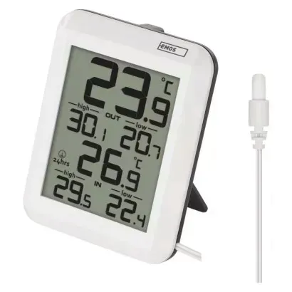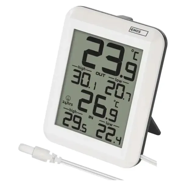 12/24 godzinny format czasu: nie|budzik: nie|ciągłe podświetlenie: nie|częstotliwość: nie|data: nie|dodatkowe czujniki: nie|indeks temperatury: nie|jednostki temperatury: °C/°F|kalendarz: nie|magnes do mocowania: nie|min. i maks. temperatura: tak|możliwość zawieszenia na ścianie: tak|odliczanie czasu maksymalnie od: nie|opakowanie: 1 szt., pudełko|ostrzeżenie temperaturowe: nie|pamięć ostatniej wartości: nie|podświetlany kolorowy wyświetlacz (black mask): nie|podświetlenie LED wyświetlacza: nie|powtarzane budzenie: nie|rodzaj: przewodowy|sonda przewodowa do czujnika: 0,9 m|stoper: nie|strefy czasowe: nie|temperatura wewnętrzna: 0 °C do +60 °C, rozdzielczość 0,1 °C|temperatura zewnętrzna: -40 °C do +60 °C, rozdzielczość 0,1 °C|trend ciśnienia: nie|trend temperatury: nie|wilgotność wewnętrzna: nie|wilgotność zewnętrzna: nie|wymiary czujnika: nie|wymiary głównej jednostki: 19 × 58 × 75 mm|wymiary wyświetlacza: 41 × 52 mm|zasięg na otwartej przestrzeni: nie|zasilacz sieciowy: nie|zasilanie czujnika: nie|zasilanie stacji: 2× 1,5 V AAA (brak w zestawie)|zegar: nie