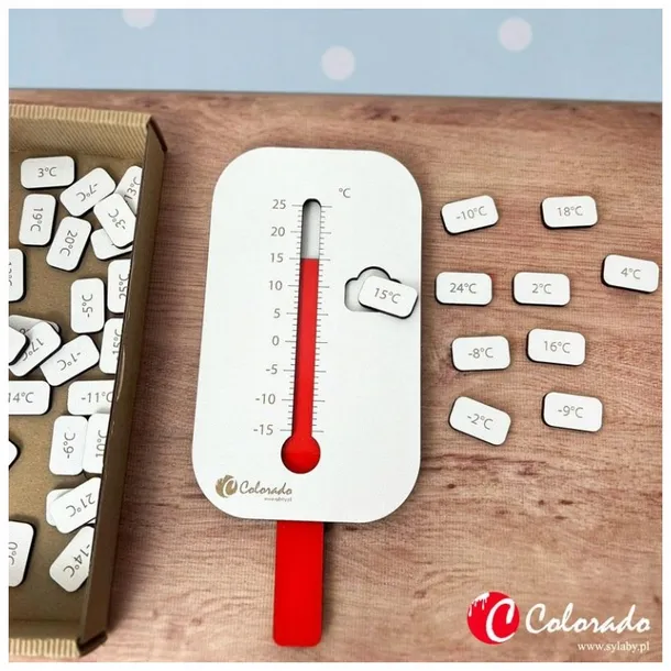 Termometr edukacyjny Termometr można wykorzystać na wiele różnych sposobów. Sprawdzi się doskonale do zabawy w domu jak i nauki podczas prac w grupie na lekcji przyrody czy matematyki. Termometr posiada ruchomy słupek rtęci. Zadaniem dziecka jest ustawienie odpowiedniej temperatury na słupku oraz dopasowanie puzzla z wartością temperaturyWymiary produktu: 16.5 cm x 9,5 cmIlość przykładów: 30