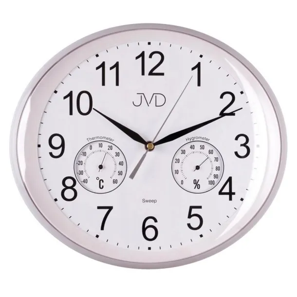 Zegar ścienny z pomiarem temperatury i wilgotności JVD HTP64.1. Wysokość cyfr 27 mm. Mechanizm - kwarcowy, z cichym "płynącym" sekundnikiem