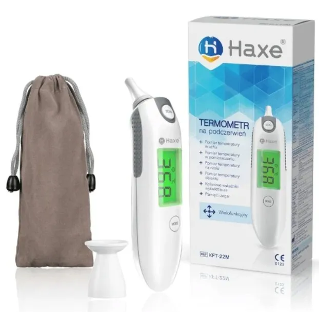 Termometr na podczerwień KFT-22M to poręczny i wielofunkcyjny przyrząd do mierzenia temperatury ciała, obiektu i otoczenia. Termometr umożliwia pomiar temperatury w uchu oraz na czole, po założeniu dodatkowej nakładki. Termometr pozwala na kontrolę temperatury pacjenta, jego otoczenia czy podawanych mu posiłków. Termometr posiada wbudowaną pamięć ostatnich 20 pomiarów. Po 25 sekundach bezczynności termometr zamienia się w zegar - wyświetla godzinę a tym samym ogranicza zużycie energii. Trójkolorowy wyświetlacz ułatwia interpretację wyniku.