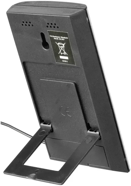 Termometr elektroniczny TFA 30.1027 z zewnętrznym czujnikiem kablowym. Instrument umożliwia pomiar temperatury powietrza w dwóch punktach, tj. w miejscu usytuowania konsoli odbiorczej (domowej), np. na parapecie okiennym i w miejscu wyprowadzenia czujnika przewodowego, np. na zewnątrz okna. Czujnik kablowy ma długość około 300 cm, a na jego końcu znajduje się sonda pomiarowa. Aby uzyskać możliwie obiektywny pomiar, zarówno konsola jak i sonda zewnętrzna nie powinny być eksponowane na źródła ciepła, czy to sztuczne (grzejnik) czy też naturalne (bezpośrednie promieniowanie słoneczne). Termometr, m.in. posiada funkcję pamięci wartości ekstremalnych.