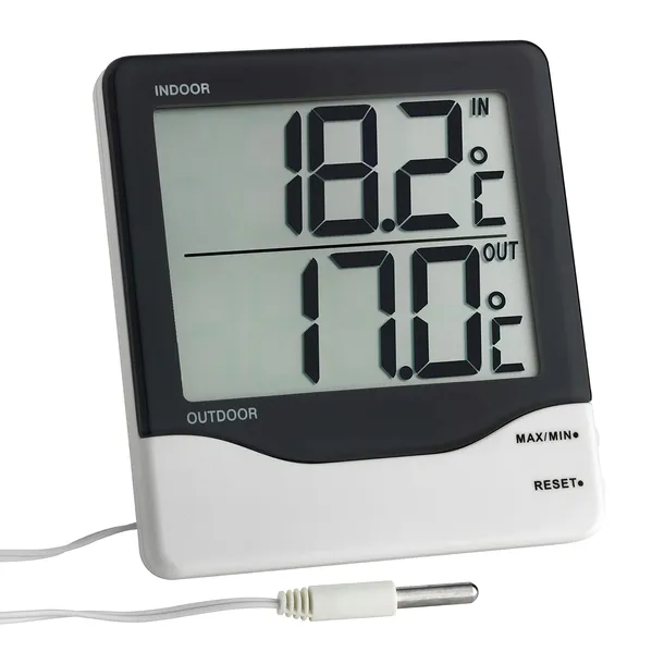 Ten funkcjonalny termometr jest idealny do jednoczesnego pomiaru temperatury wewnętrznej i zewnętrznej. Kontrola temperatury w pomieszczeniu jest ważnym czynnikiem zapewniającym komfortowe i zdrowe środowisko życia oraz pomaga oszczędzać energię. Obniżenie temperatury tylko o jeden stopień obniża koszty ogrzewania nawet o 6 procent. Umieszczony przy oknie kabel czujnika do pomiaru temperatury zewnętrznej jest po prostu wyprowadzony na zewnątrz. Pamięć maks.-Min. Z ręcznym resetowaniem umożliwia obserwację wartości szczytowych w wybranym przez siebie okresie.