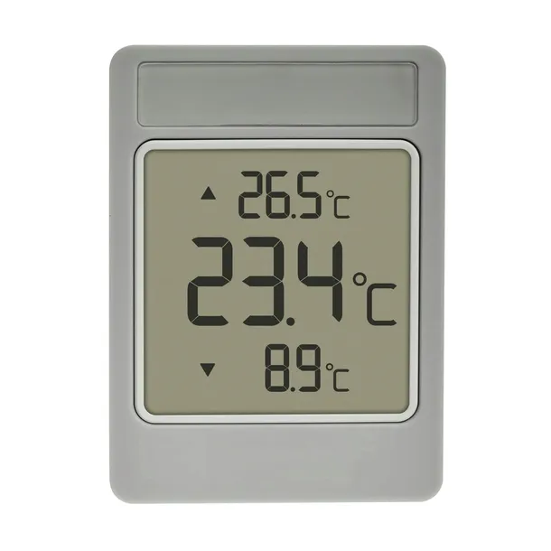- Termometr zewnętrzny z nowoczesnym designem w kolorze szaro-białym.