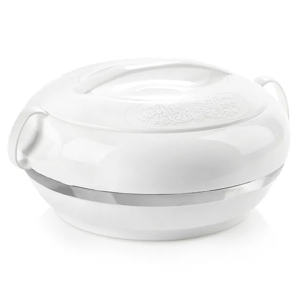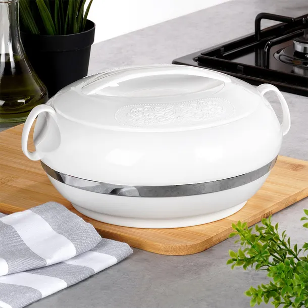 WYTRZYMAŁA - Termomisa z zewnątrz wykonana z tworzywa w kolorze białym, wewnątrz ze stali nierdzewnej. Pokrywa posiada efektowny dekor.