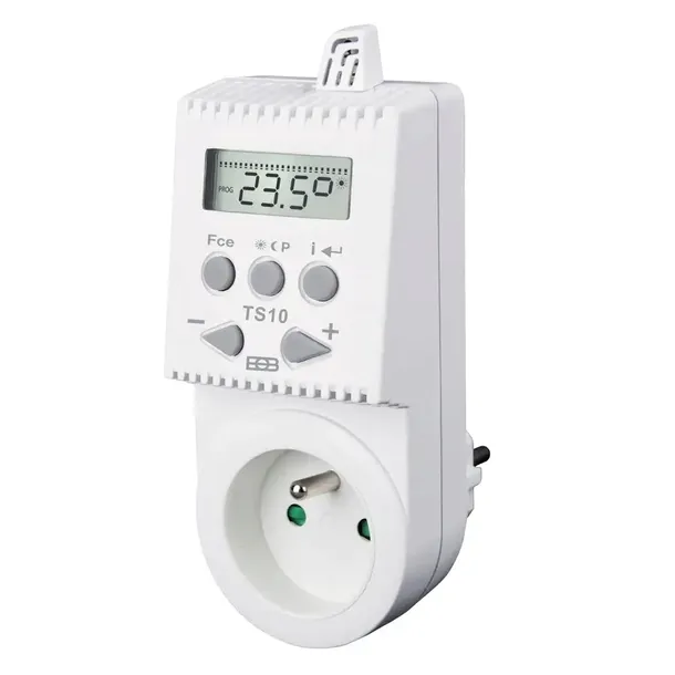TS10 - to rozwiązanie dla elektrycznych systemów grzewczych (konwektory, grzejniki, drabinki, panele grzewcze na podczerwień itp.). Termostat z funkcją zaprogramowania dowolnego programu na każdy dzień tygodnia. Pełen zakres programowania z możliwością ustawienia temperatury z dokładnością co do dnia i godziny. Przystosowany do 4 zmian temperatury w ciągu dnia. Nastawioną temperaturę zachowuje pamięć E-EPROM przy awarii zasilania lub wyjęcia z gniazda. Automatyczna regulacja ogrzewania pozwala zaoszczędzić do 30% energii. Do wykorzystania w domu, biurze, itp.