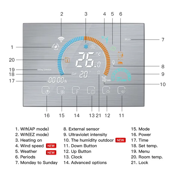 2. Metalowy panel szczotkowany z obsługiwaną stacją pogodową : Temperatura wewnętrzna i wilgotność zewnętrzna/ultrafiolet są monitorowane i wyświetlane na ekranie LCD, wciśnięte 3-4 minuty po podłączeniu, wyświetlając lokalną pogodę, w tym temperaturę wewnętrzną i poziomy wilgotności względnej na zewnątrz, a także Status wiatru. Niesamowita srebrna ramka i prostokątny wyświetlacz pomagają chronić oczy dzięki wyraźnemu wyświetlaczowi cyfrowemu z opcjonalnym stopniem Fahrenheita lub Celsjusza, zaprojektowanemu z myślą o łatwości użytkowania i dopasowaniu do każdego stylu pomieszczenia, dokładność 1 ℃ utrzymuje temperaturę na ustawionym poziomie. : Wyświetlana wilgotność, pogoda i ultrafiolet dotyczą danych zewnętrznych ze stacji pogodowej.)