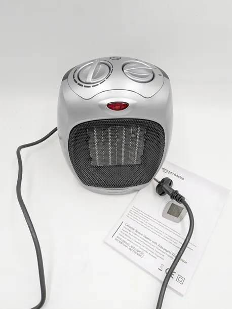 - Grzejnik ceramiczny z regulowanym termostatem, dostosowany do użytku w domu lub biurze.