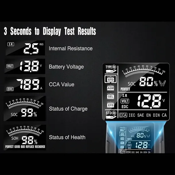 - Wynik testu: SOH, SOC, CCA Value, IR, itp.