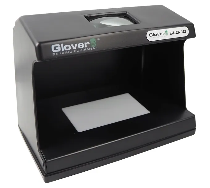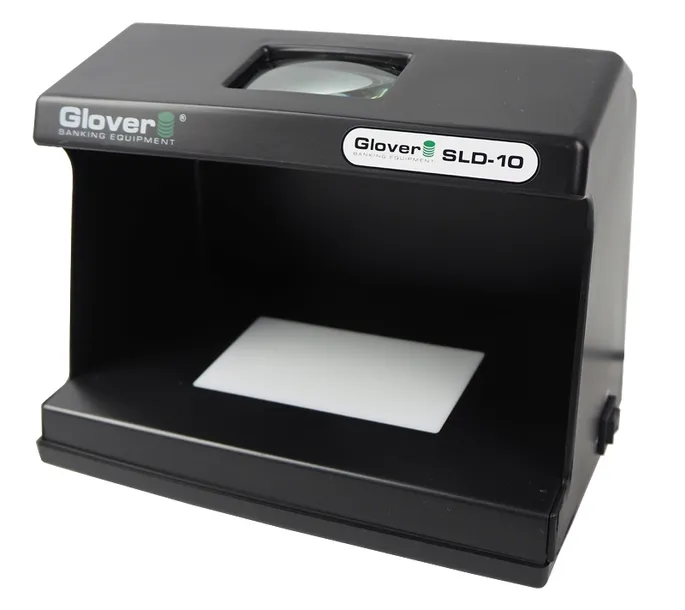Tester do banknotów Glover SLD-10 UV to uniwersalne urządzenie do weryfikacji prawdziwości znaków pieniężnych (banknotów), kart kredytowych, dokumentów, itp. Proces ten umożliwia specjalna konstrukcja oparta na dwóch źródłach światła (ultrafioletowego – 365 nm i białego) i wbudowanym szkle powiększającym. Zastosowanie stacjonarnego powiększenia zwiększa dokładność badania zabezpieczeń widocznych w promieniach ultrafioletowych (ukryte cechy charakterystyczne i poziom reemisji widma przez papier), w świetle białym przechodzącym (znak wodny, obecność nitki zabezpieczającej i element recto-verso) i mikrodruków. Tester w swojej pracy wykorzystuje nowoczesną świetlówkę o podwyższonej trwałości typu "U" o mocy (9W). Podsumowując tester do banknotów Glover SLD-10 UV dzięki praktycznej konstrukcji, przyjaznej estetyce i umiarkowanym wymiarom jest ciekawą i wartościową propozycją dla klientów o średnich i dużych wymaganiach.