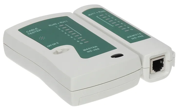 Tester NS-468 testuje poprawność zaprawienia kabla, kolejność żył we wtyku RJ-45, RJ-12 oraz RJ-11. Test odbywać się może z dwoma prędkościami. Tester może być pozostawiony z jednej strony przewodu, natomiast pilotem można wpiąć się na drugim końcu i dokonać pomiaru. Urządzenie wykonane jest z wytrzymałego tworzywa sztucznego co doskonale przydaje się podczas prac instalatorskich i gwarantuje długotrwałą poprawną pracę.