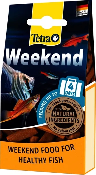 Tetra TetraMin Weekend to pełnowartościowy, kompletny pokarm w formie pałeczek przeznaczony do karmienia ryb ozdobnych podczas weekendów i krótkich wyjazdów wakacyjnych. Zawiera wszystkie substancje odżywcze, witaminy i mikroelementy niezbędne dla dobrej kondycji ryb. Bogaty w proteiny, minerały i podstawowe aminokwasy zapewnia rybom pożywienie podczas nawet 6-dniowej nieobecności opiekunów. Nie pleśnieje, więc nie powoduje zmętnienia wody. Dostępny w formie dużych pałeczek łatwych do dozowania w zależności od wielkości akwarium i liczby ryb.