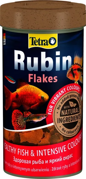 Kompletny pokarm zawierający naturalne składniki, które poprawiają ubarwienie ryb, stanowiący codzienną dietę wszystkich ryb ozdobnych. TETRA Rubin Flakes to pokarm płatkowany bogaty w naturalne składniki wzmacniające wybarwienie ryb. Poza substancjami wybarwiającymi produkt zawiera również wszystkie niezbędne składniki odżywcze oraz witaminy, w tym stabilizowaną witaminę C zwiększającą odporność.